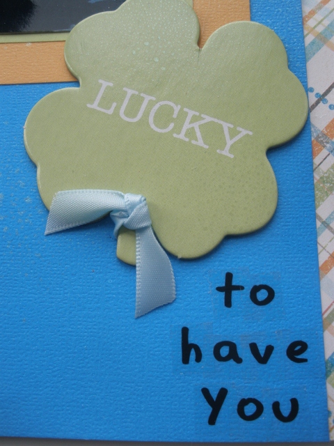Ribbon was knotted around the shamrock stem. The chipboard was misted. I completed my sub title using clear stickers.